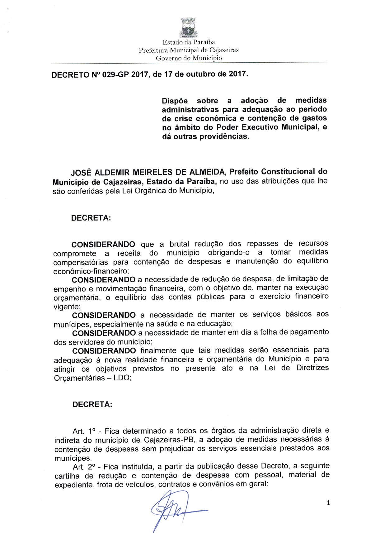 Após a repercussão das denúncias do vereador Rivelino Martins, no início da tarde desta terça-feira (17) o prefeito José Aldemir Meireles emitiu um decreto em que adota medidas administrativas para conter gastos na máquina pública.