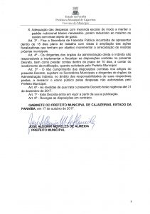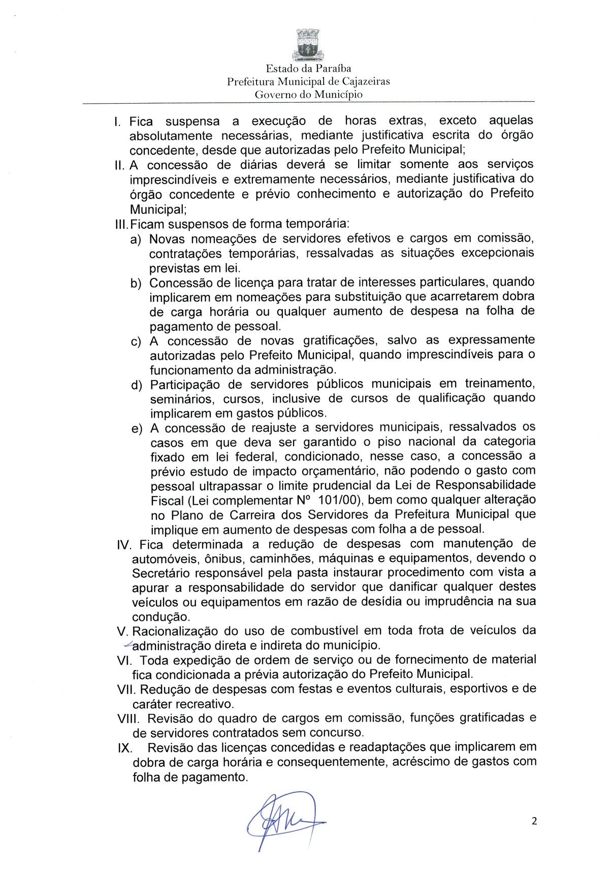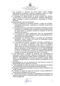 Entre outras medidas estão a suspensão temporária de contratação de servidores, com exceção do que é previsto em lei; suspenção de concessão de novas gratificações sem autorização do prefeito; e determina a revisão do quadro de cargos de comissão, gratificações e de servidores contratados sem concurso.