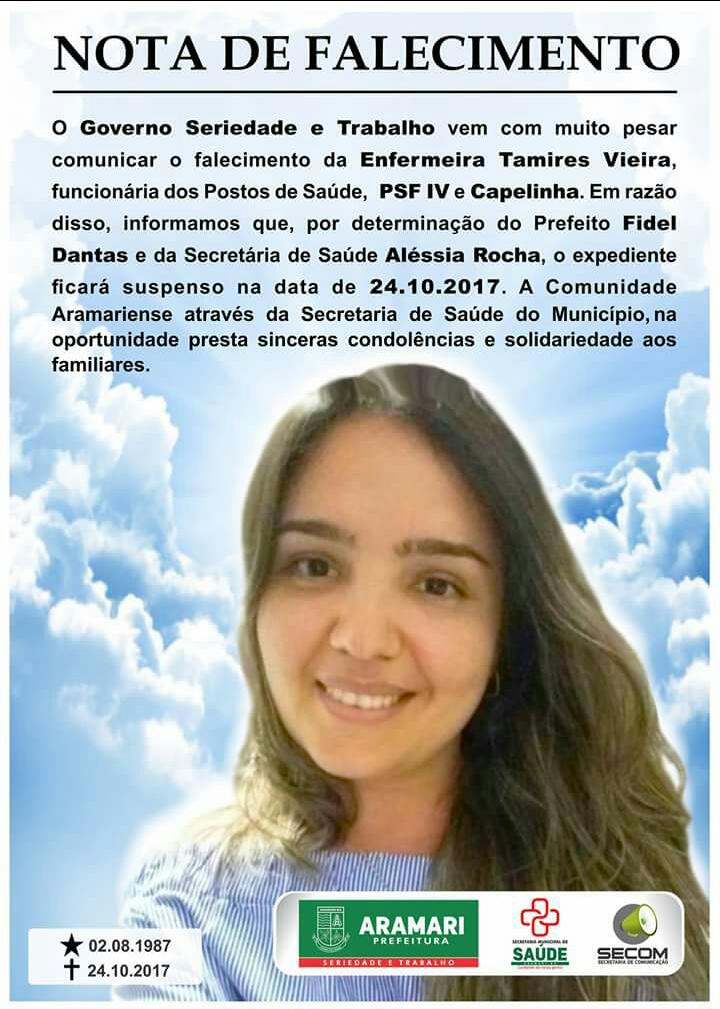 Faleceu nessa terça-feira (24), na cidade de Aramari, Estado da Bahia, a jovem enfermeira natural de Carrapateira, Sertão da Paraíba, Tamires Vieira, de 30 anos. Ela era funcionária da prefeitura baiana. A morte da enfermeira teria sido causada por complicações pós-parto. O filho de Tamires, que nasceu prematuro de sete meses faleceu nesse sábado (21).