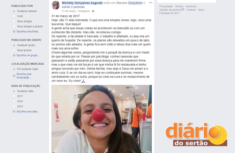 Mensagem postada por Michelly em sua rede social no dia 31 de março de 2017