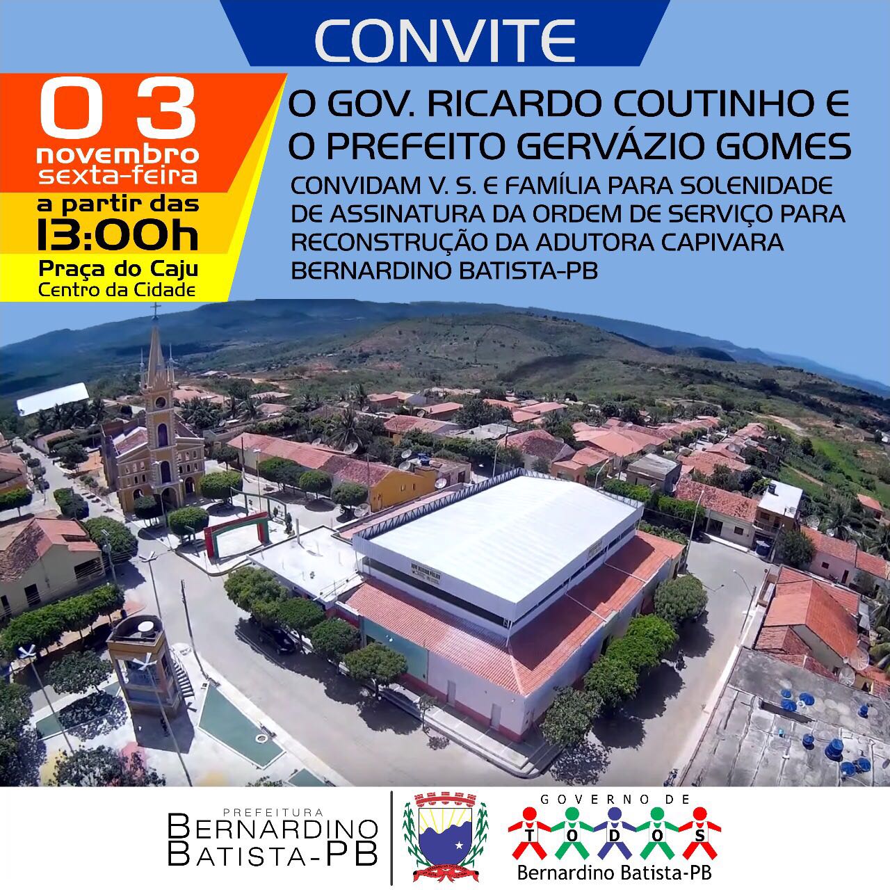 O governador Ricardo Coutinho (PSB) volta a Bernardino Batista, Sertão da Paraíba nessa sexta-feira (3), para assinar a ordem de serviço para construção da nova adutora, que levará água aos moradores Açude Capivara, localizado em Uiraúna. Ricardo Coutinho construiu a estrada que dá acesso a cidade, uma reivindicação desde a emancipação política de Bernardino Batista.