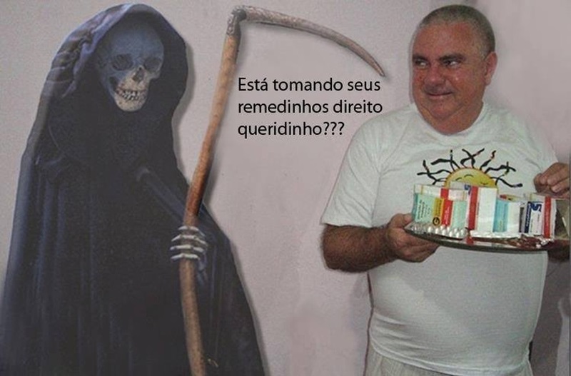 E não é apenas no cemitério que o aposentado brinca com a morte. Em seu perfil no Facebook, é comum postar imagens como se ele já estivesse dentro do próprio caixão ou conversando com a caveira com a foice na mão, símbolo da morte.