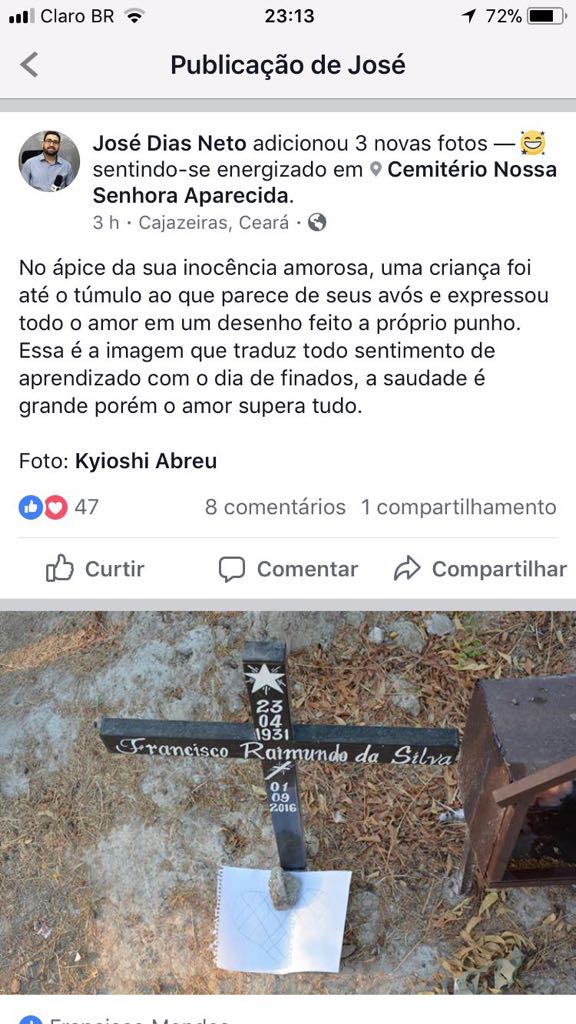 Um desenho encontrado nesse Dia de Finados (2 de novembro), no túmulo de Francisco Raimundo da Silva, no cemitério Nossa Senhora Aparecida, Zona Leste de Cajazeiras chamou a atenção.