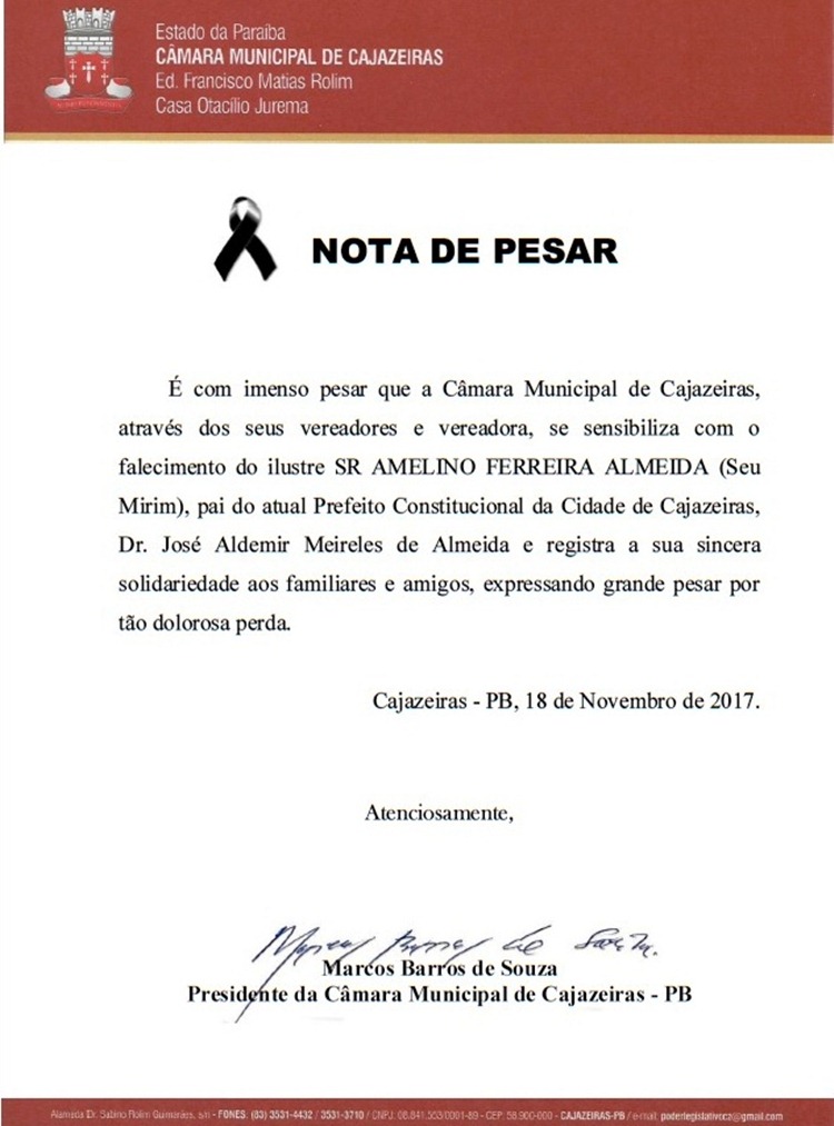 A Câmara Municipal de Cajazeiras, através do presidente Marcos Barros (PSB) também divulgou nota de pesar: