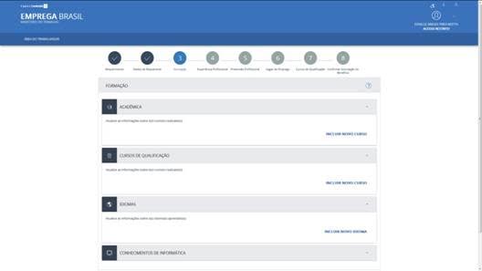 · Uma das páginas permite ao trabalhador colocar informações sobre sua qualificação acadêmica e profissional, dados importantes para que o programa busque vagas de emprego disponíveis na área do trabalhador: