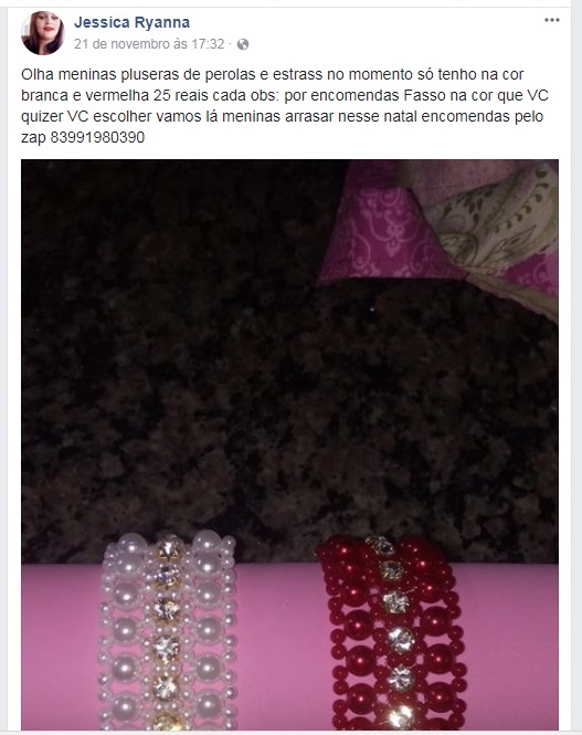 Jéssica, que produzia bijuterias para vender e ajudar no orçamento doméstico da família postou duas peças e anunciou novidades para a clientela já para o Natal. Ela deixou cinco filhos pequenos.