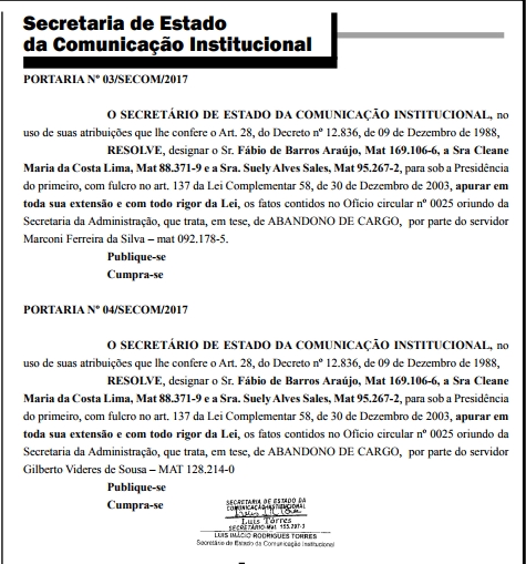 Dois jornalistas dos quadros da Secretaria de Comunicação do Estado poderão ser demitidos por abandono de emprego. São eles: Marconi Ferreira da Silva e Gilberto Videres de Sousa, da cidade de Sousa, Sertão da Paraíba.