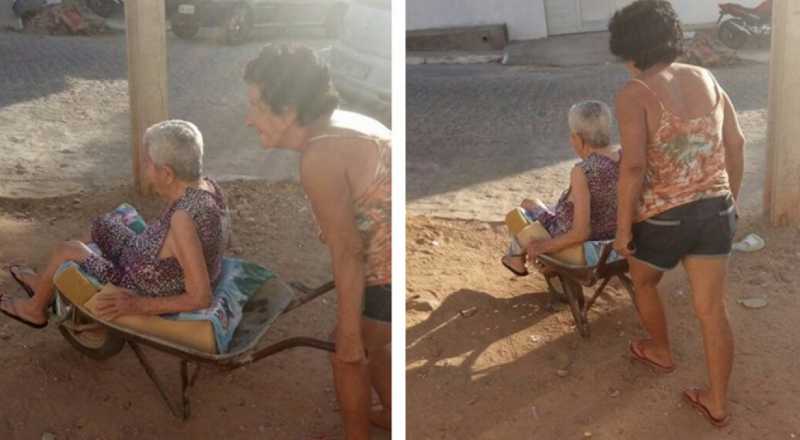 Uma foto compartilhada nas redes sociais nesta semana causou indignação nas pessoas. A imagem mostra uma idosa sendo levada de carro de mão por uma de suas filhas porque a família não tem condições de comprar uma cadeira de rodas.
