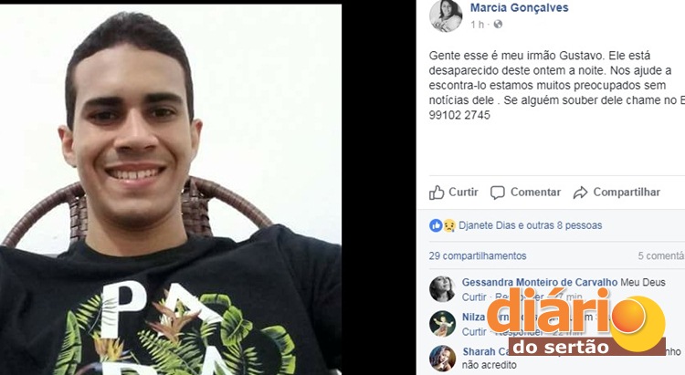 No Facebook, Márcia Gonçalves, que é irmã de Gustavo, postou uma mensagem fazendo um apelo para tentar localizar o jovem que já se encontra em sua residência.