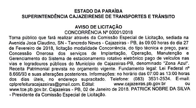 A Comissão Especial de Licitação da Prefeitura de Cajazeiras, através da Superintendência Cajazeirense de Trânsito (SCTrans), divulgou nessa terça-feira (02) o aviso da Concorrência Pública Nº 0001/2018 para a realização do processo licitatório para os serviços de implantação, operação, manutenção e gerenciamento do sistema de estacionamento rotativo eletrônico de veículos nas vias e logradouros públicos do município de Cajazeiras denominado “Zona Azul”. O certame será realizado no dia 27 de fevereiro no Centro Administrativo, localizado na Avenida Joca Claudino, S/N, Bairro Tancredo Neves.