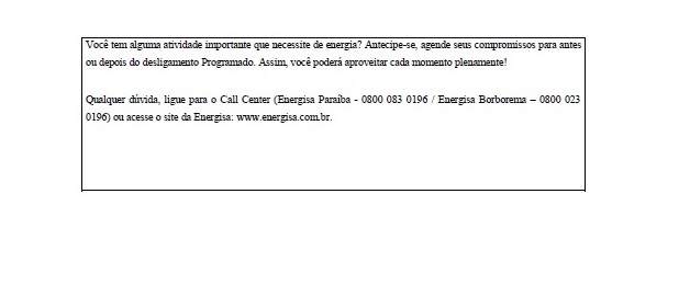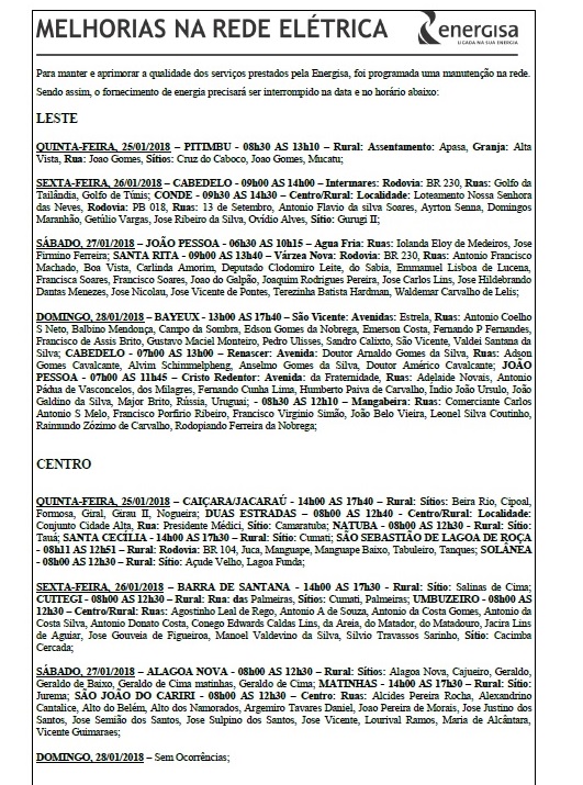 A Energisa esclarece que, para manter a qualidade na prestação de serviço, a concessionária realiza diariamente e de forma rotineira obras de manutenção e melhorias na rede de distribuição. É uma ação regularizada extremamente necessária para evitar os desligamentos emergenciais. Para executar esse tipo de trabalho, é preciso suspender, por um intervalo de tempo informado com antecedência mínima de 72 horas, o fornecimento de energia em áreas onde acontecerão as obras.