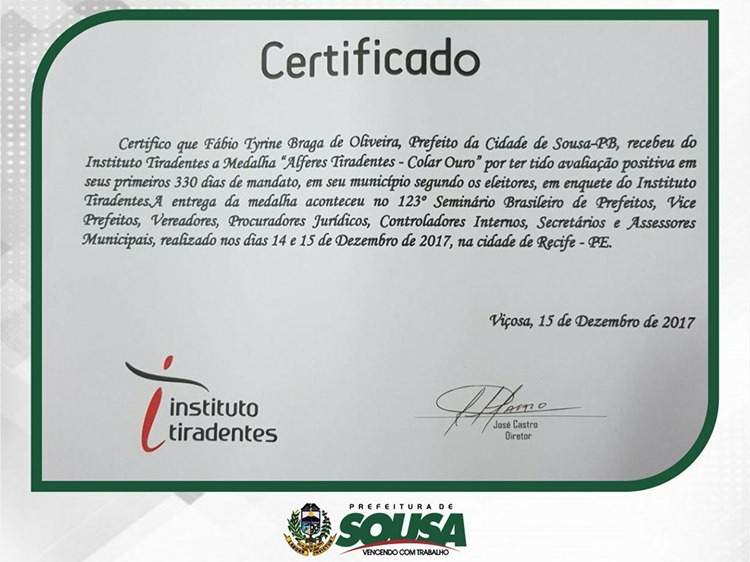 O Prefeito de Sousa, Fábio Tyrone, recebeu o destaque por ter avaliação positiva em seus primeiros 12 meses de governo. Em razão disso, recebeu a Medalha “Alferes Tiradentes – Colar Ouro”, do Instituto Tiradentes.