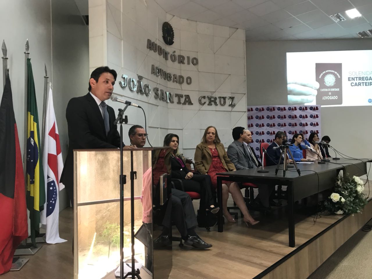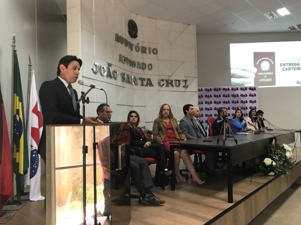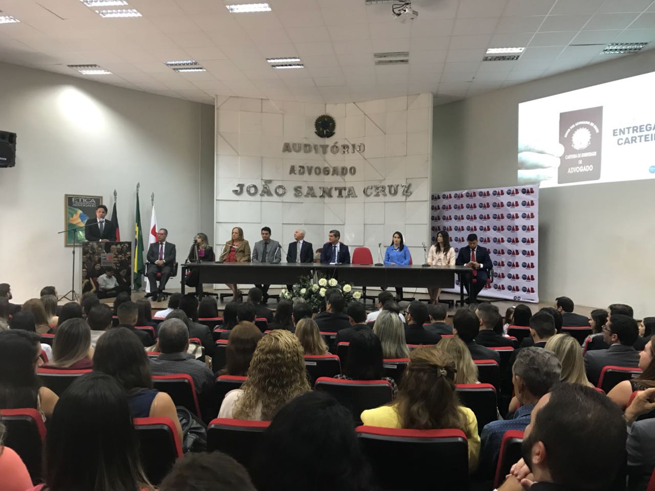 Nesta terça (27), a Ordem dos Advogados do Brasil, Seccional Paraíba (OAB-PB), realizou solenidade no auditório de sua sede para entrega de carteiras a 79 novos advogados, sendo a solenidade comandada pelo advogado Paulo Maia, Presidente da OAB-PB, contando com a participação da Diretora Tesoureira Tainá de Freitas, do Presidente da Subseção de Cajazeiras João de Deus Quirino Filho, representando o Poder Judiciário o Desembargador Marcos Cavalcanti e do Ministério Público, Promotor João Geraldo, além de integrantes de diversas comissões, novos advogados e familiares.