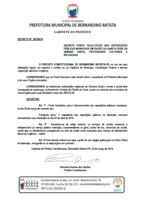 O prefeito da cidade Bernardino Batista, Gervázio Gomes (PSB) decretou nessa quarta-feira (28), Ponto Facultativo nos Órgãos públicos municipais da Administração direta e indireta, para essa quinta-feira (29), em virtude da tradicionalidade da “Semana Santa”.