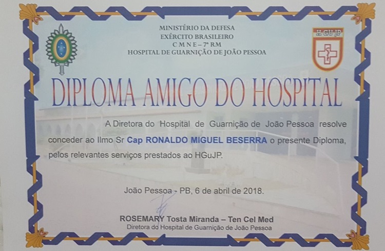 O Conselheiro Federal do Conselho Federal de Enfermagem (COFEN), Ronaldo Beserra, foi homenageado com uma honraria de amigo do Hospital de Guarnição (HGU-JP) do Exército Brasileiro localizado em João Pessoa.