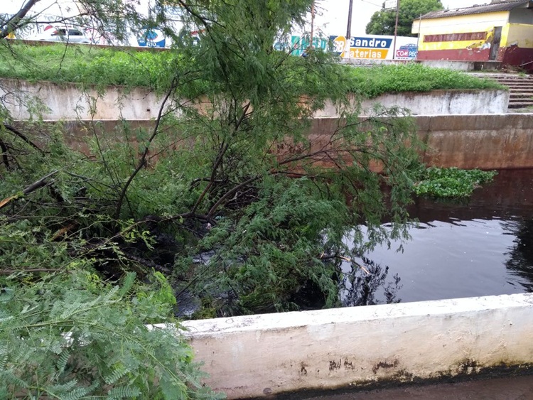 Parte da árvore caiu dentro do canal e está dificultando a passagem da água da sangria do manancial, que está aumentando após as chuvas desta madrugada.