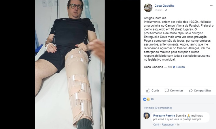 O vereador Cacá Gadelha (PMDB) fraturou o joelho Às 19:30 desta quarta-feira (11) quando participava de uma partida de futebol na cidade de Sousa e foi socorrido ao Hospital Santa Terezinha em Sousa.