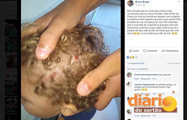 Em sua página pessoal no Facebook, o comerciante Bruno Braga, que é pai do garoto afirmou que ficou sabendo do acontecido por uma professora e cobrou providências por parte do prefeito de São João do Rio do Peixe em relação a estrutura do prédio da creche.