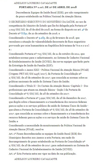 Em portaria publicada em 27 de abril, o Ministério da Saúde comunicou o descredenciamento de equipes de saúde bucal por perda de prazo para o cadastramento no Sistema de Cadastro Nacional de Estabelecimentos de Saúde, que terminou em 28 de setembro de 2017.