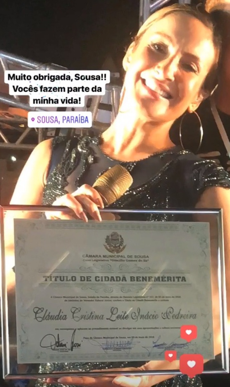 Claudia Leitte recebe título de cidadã benemérita de Sousa e comemora em suas redes sociais