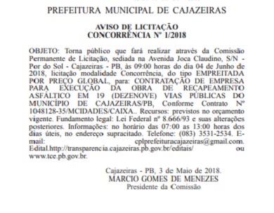 A Prefeitura Municipal de Cajazeiras publicou o Edital de Licitação, modalidade concorrência, para o recapeamento de 19 ruas da cidade, que ocorrerá dia quatro de junho às 9h, na Comissão Permanente de Licitação, localizada na avenida Joca Claudino, no Bairro do Pôr do Sol. Os recursos são da ordem de R$ 3,4 milhões de reais.