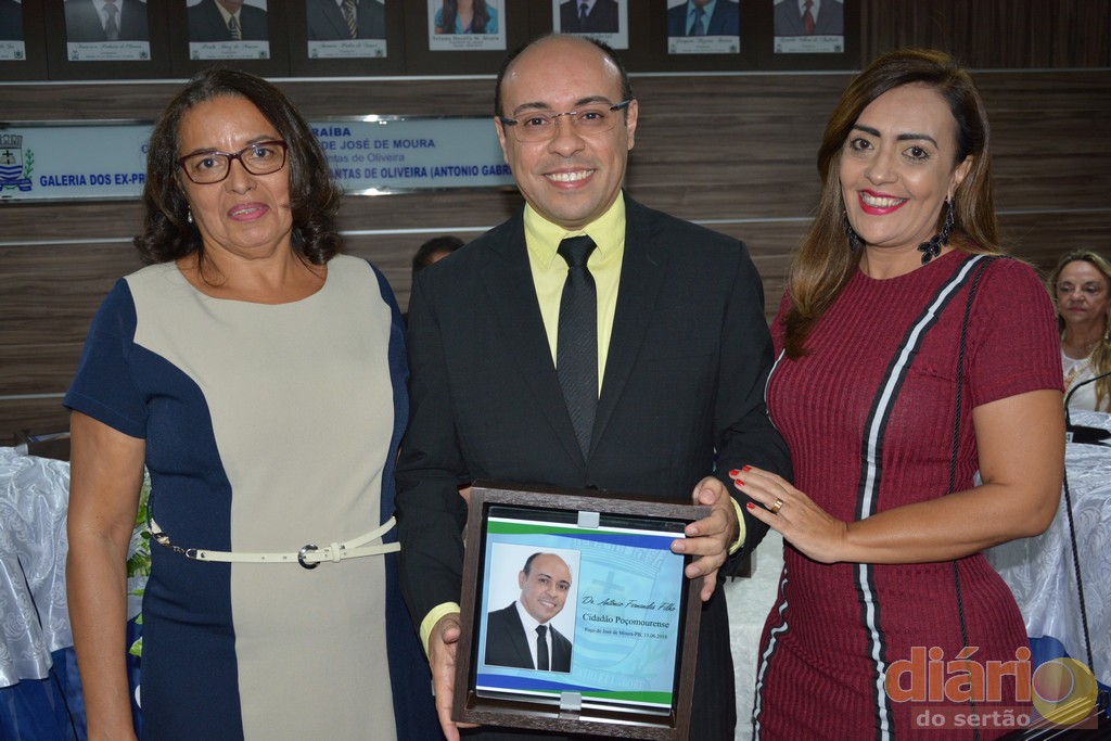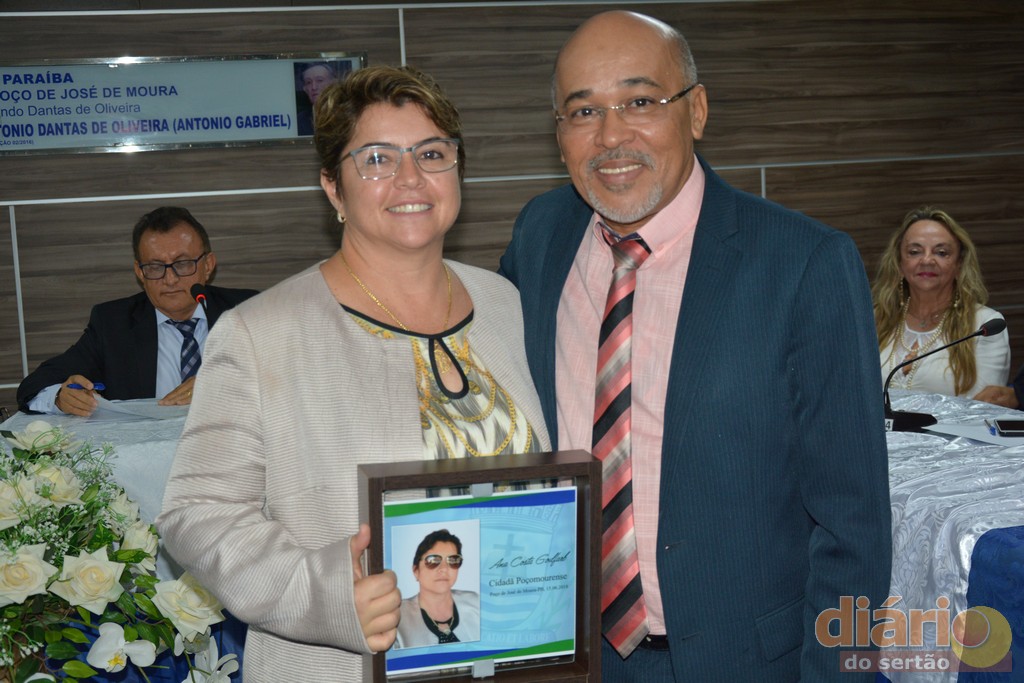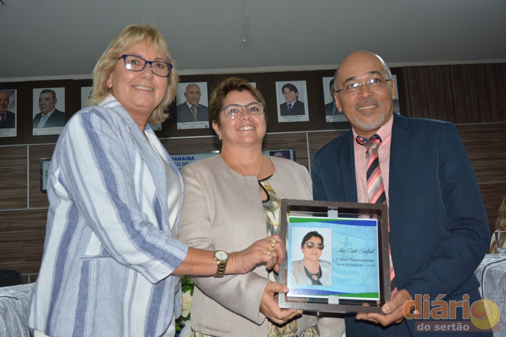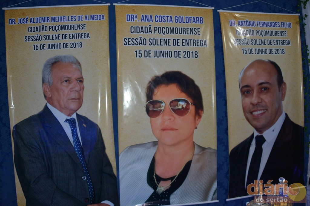 A Câmara Municipal da cidade de Poço José de Moura concedeu nesta sexta-feira (15), em sessão solene títulos de cidadã e cidadãos poçomourense a três personalidade influentes da região de Cajazeiras, Ana Goldfarb diretora de uma das maiores instituições de ensino do nordeste, a Faculdade Santa Maria; Dr. Antônio Fernandes diretor do campus da UFCG de Cajazeiras e ao ex-deputado Estadual e atual prefeito de Cajazeiras, o médico, José Aldemir.