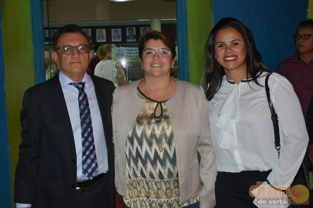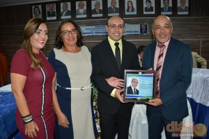 Sócia proprietária da FSM, Ana Goldfarb recebe a homenagem das mãos do vereador Pinheiro e da prefeita, Aurileide Egídio de Moura (Foto: José Dias Neto)