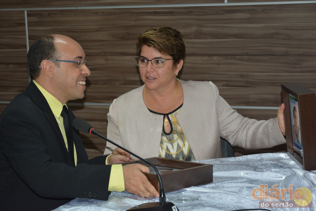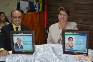 - Sócia proprietária da FSM, Ana Goldfarb recebe a homenagem das mãos do vereador Pinheiro e da prefeita, Aurileide Egídio de Moura (Foto: José Dias Neto)