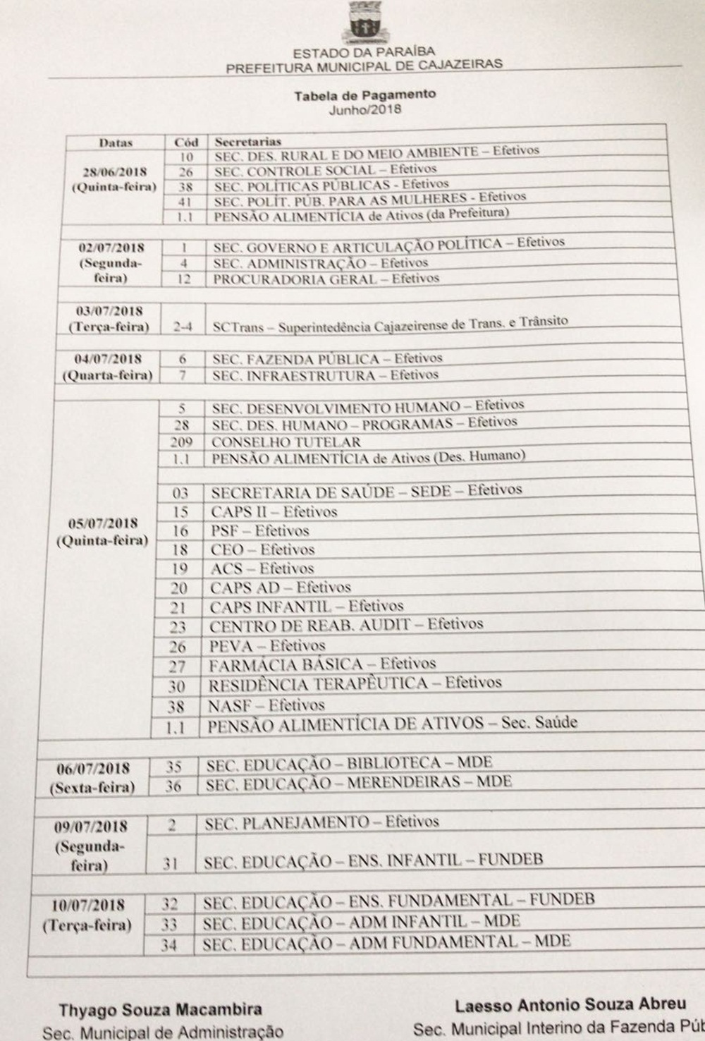 A Prefeitura Municipal de Cajazeiras prossegue o pagamento dos servidores municipais referente ao mês de Junho, cumprindo tabela elaborada pelas Secretarias de Administração e Fazenda Pública.