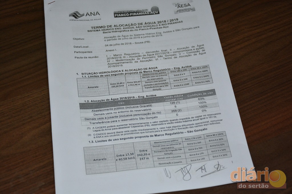 Mas o ponto alto da reunião para os cajazeirenses foi a entrega do Termo de Alocação de Águas da ANA nas mãos do presidente da Câmara Municipal de Cajazeiras, vereador Marcos Barros. O termo garante que até julho de 2019 as águas do Açude de Boqueirão não podem ser retiradas para abastecer outros mananciais.