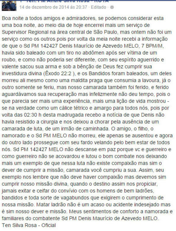 Na postagem ele relata a morte de um policial que foi ferido a bala durante um assalto. Usando várias referências bíblicas, capitão Silva Rosa diz, entre outras coisas, que “com seu espírito aguerrido e valente, sacou sua arma e sob a benção de Deus fez cumprir sua investidura divina”, referindo-se aos tiros que o policial acertou nos criminosos.