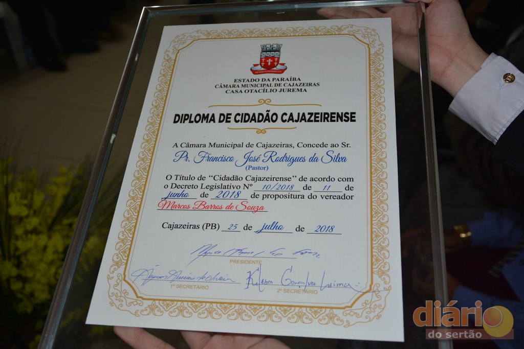 Em uma sessão especial realizada na sede da igreja, pastor Francisco José recebeu o título de Cidadão Cajazeirense da mãos do presidente da Câmara.