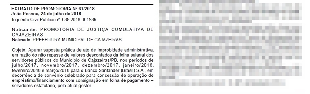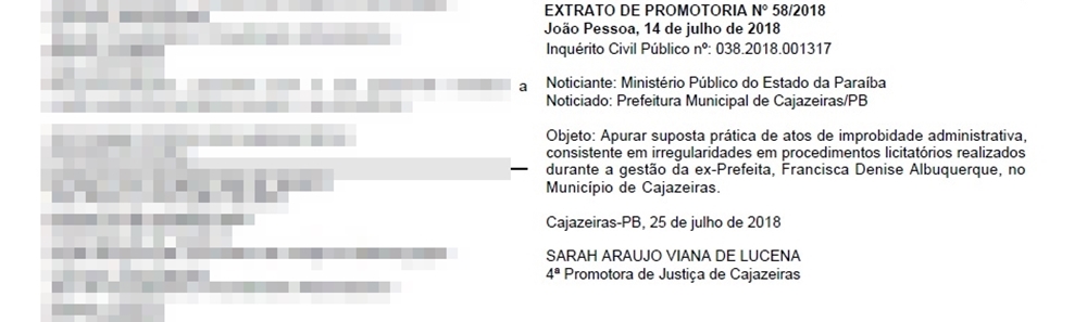 O Ministério Público da Paraíba, através da 4ª Promotora de Justiça de Cajazeiras Sarah Araújo instaurou esta semana um Inquérito Civil Público para apurar supostas práticas de atos de improbidade administrativa da ex-prefeita Francisca Denise Albuquerque de Oliveira (PSB) e outro para apurar descontos feitos na folha de pagamento de servidores e não repassados ao banco na atual gestão do prefeito José Aldemir Meireles (PP).