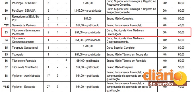 O edital mostra claramente que as vagas ofertadas para técnicos de enfermagem, não apresentam qualquer diferencial remuneratório pela formação especifica, igualando assim com outros cargos oferecidos que não exigem formação.