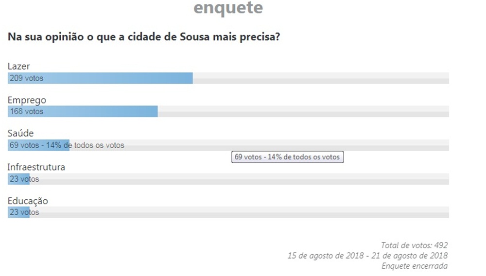 Em enquete realizada pelo Portal Diário do Sertão, a população de Sousa reivindica mais lazer. A enquete foi ao ar em 15 de agosto e encerrada nessa segunda-feira (21) com 492 votos.