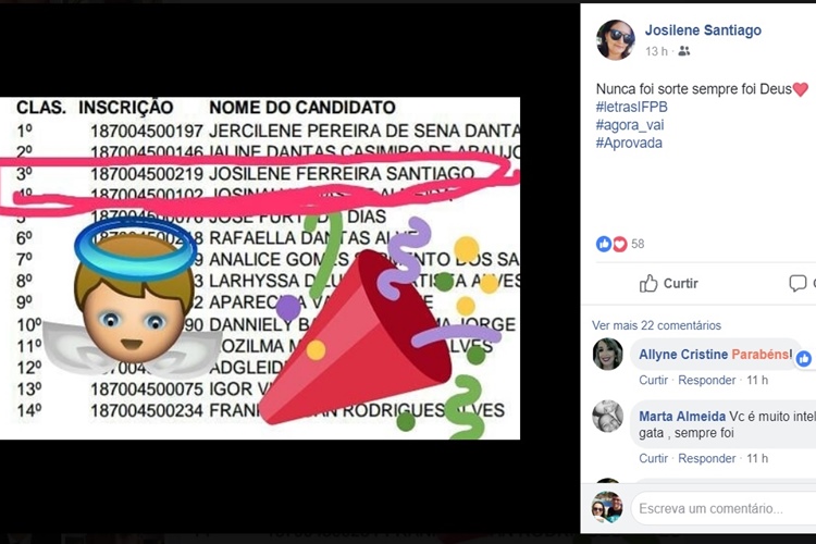 No Facebook, Josi postou uma mensagem comemorando a aprovação: "Nunca foi sorte, sempre foi Deus"