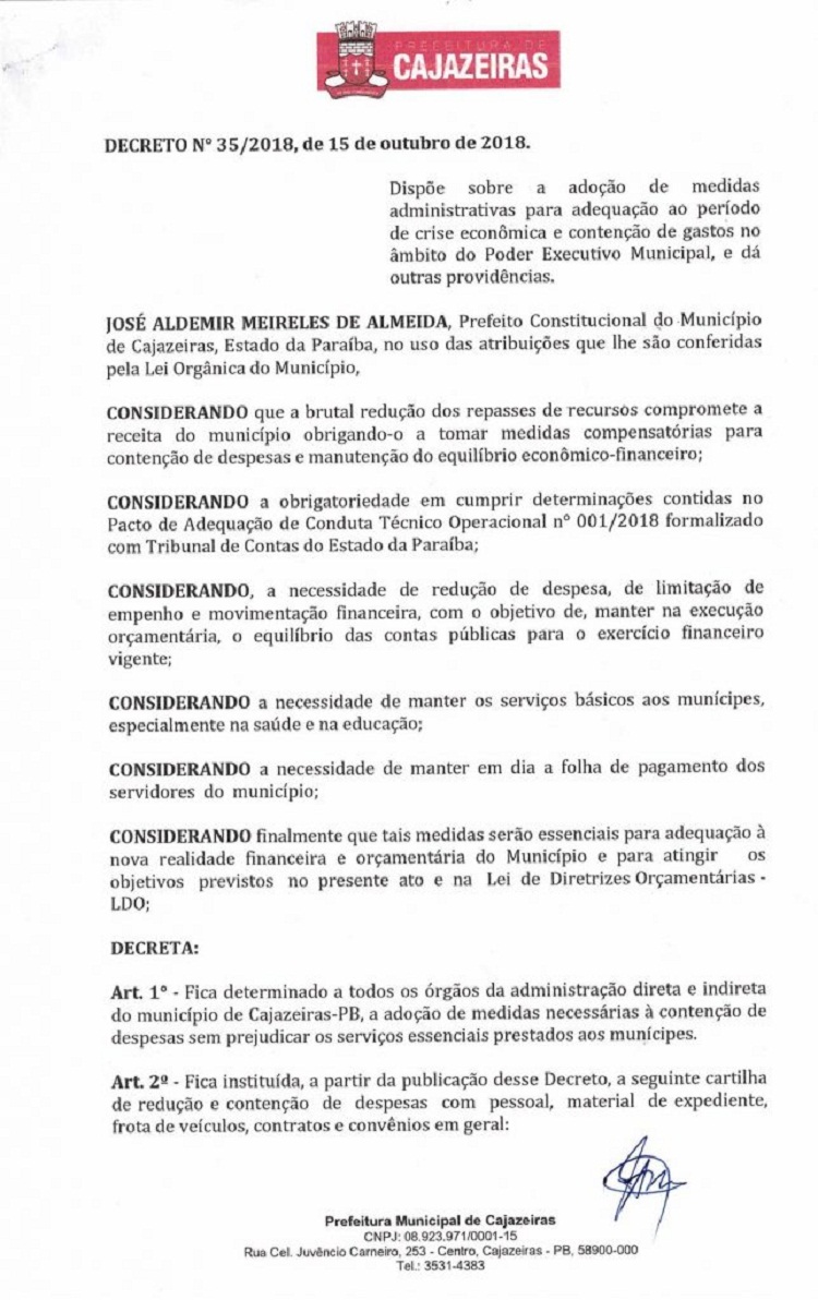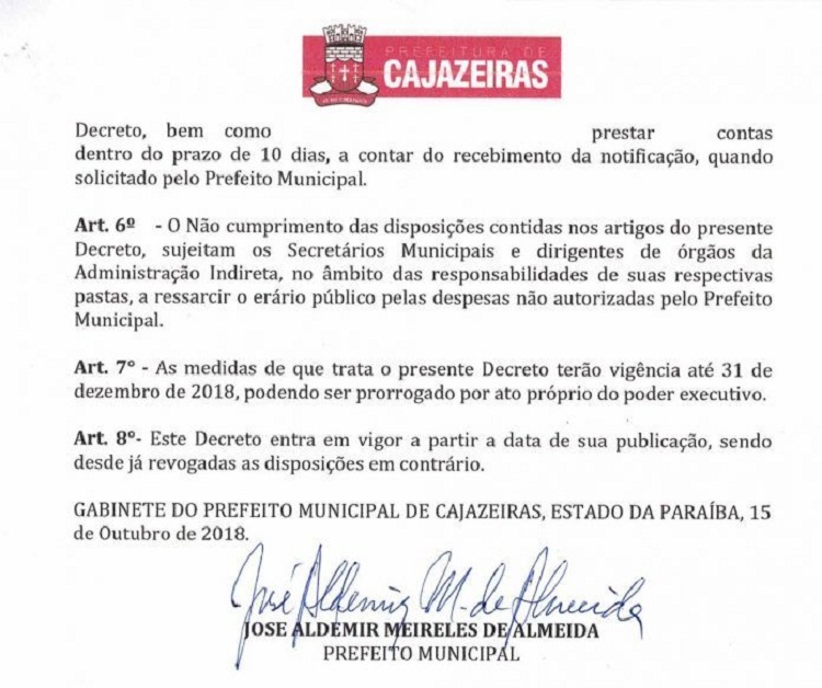Da mesma forma como fez ano passado, o prefeito de Cajazeiras, José Aldemir (PP), assinou Decreto Nº 35/2018 de 15 de outubro, que dispõe sobre adoção de medidas administrativas para adequação à crise econômica e contenção de gastos no âmbito do Poder Executivo Municipal.