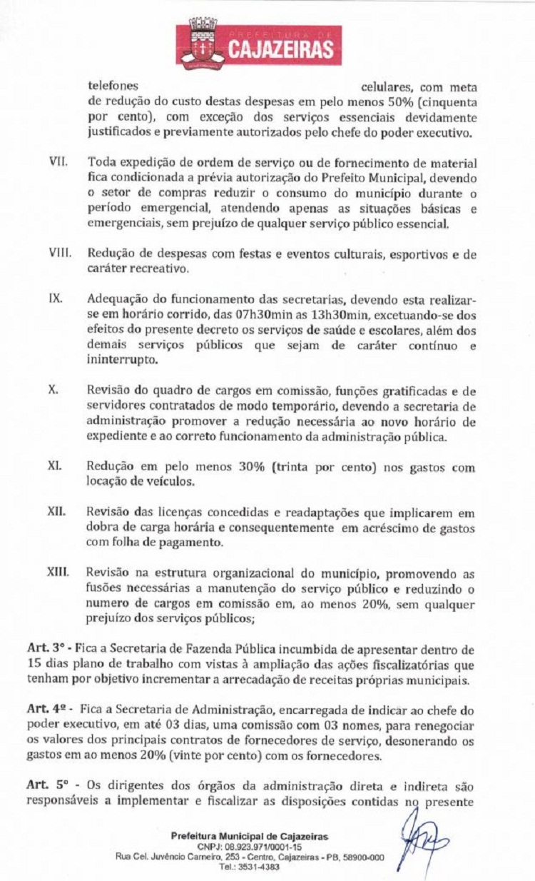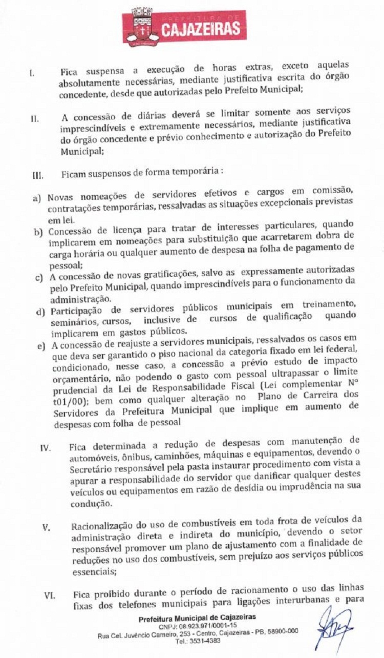 Devido às reduções nos repasses de recursos para o município de Cajazeiras, o chefe do Executivo sentiu-se na obrigação de tomar medidas duras para conter as despesas e manter o equilíbrio econômico das ações básicas da administração pública.