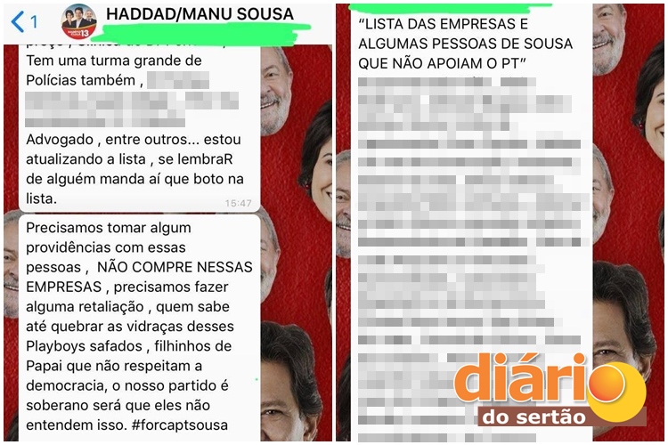 Na lista intitulada como: “Lista das Empresas e algumas pessoas de Sousa que não votam no PT”, foram compartilhadas no referido grupo da rede social, onde os participantes estariam sugerindo ‘ameaçar’ ou até mesmo retaliar esses nomes contidos na lista, que são eleitores do candidato da oposição, Jair Bolsonaro (PSL).