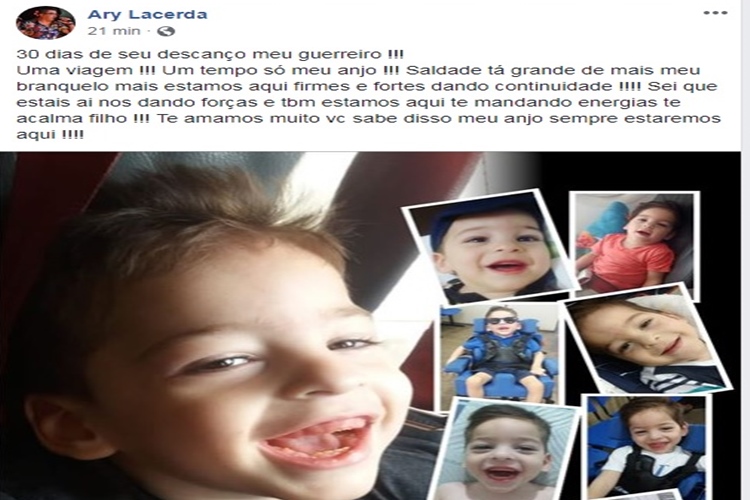 O cantor sousense Ary Lacerda, publicou nessa quarta-feira (24), através da sua página oficial no Facebook, uma homenagem ao seu filho, João Pedro Lacerda de 04 anos, falecido no dia 24 de setembro.