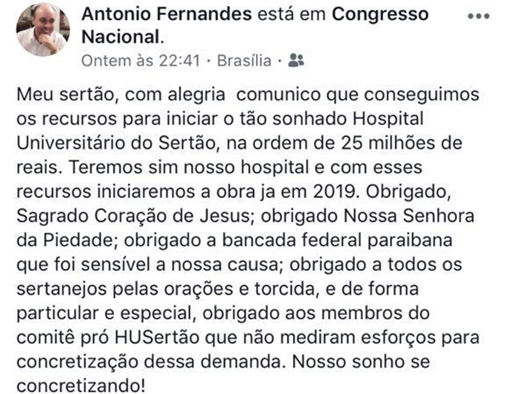 “Com este recurso a EBSERH já tem condições de licitar a 1ª etapa da construção do hospital ainda no primeiro semestre do próximo ano” disse o diretor da UFCG, Campus de Cajazeiras, o professor Antônio Fernandes.