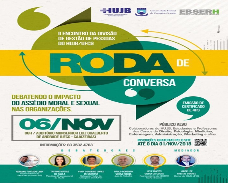 A “Roda de Conversa: Debatendo o impacto do Assédio Moral e Sexual nas Organizações” contará com a presença de debatedores das mais diversas áreas. Entre eles estão: o representante do Sindicato Sindserh/PB – Adriano Furtado Lima; a Psicóloga organizacional do HUJB – Tayrine Matias de Paula; a Delegada Titular da Delegacia da Mulher de Cajazeiras – Yvna Cordeiro Lopes de Siqueira; o Juiz do Trabalho de Sousa – Paulo Roberto Vieira Rocha; e o representante da EBSERH Sede – Heli Santos Vieira da Costa. Além disso, a Roda de Conversa terá como mediador o diretor do Centro de Ciências Jurídicas e Sociais, da Universidade Federal de Campina Grande, Jardel de Freitas Soares.