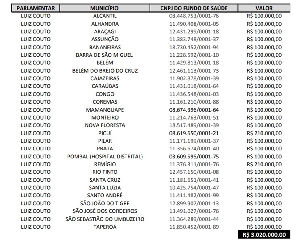 O Fundo Nacional de Saúde (FNS) liberou no último dia 30 um total de R$ 35.224.315,00 em pagamentos de emendas de bancada para diversos municípios do Estado da Paraíba. Deste valor, R$ 3.020.000,00 se referem a indicações feitas pelo deputado federal Luiz Couto (PT).