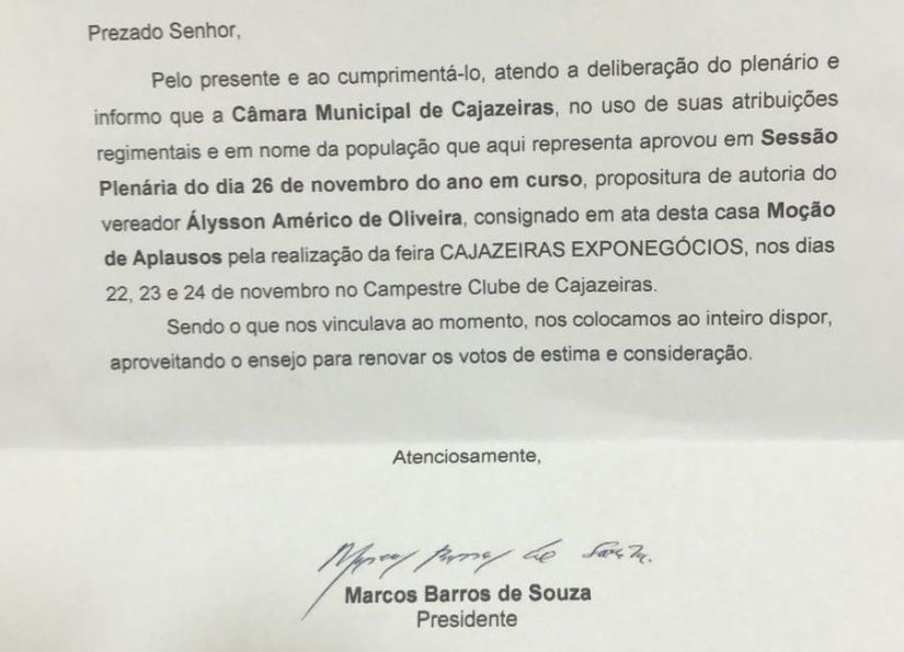 “Essa Moção de Aplausos que recebi da Câmara de Vereadores de Cajazeiras compartilho com todos vocês, pois essas palmas devem ser dadas a vocês que acreditaram no projeto e não mediram esforços para que ele se concretizasse. Agradeço de coração a cada um e vamos a 2019”.