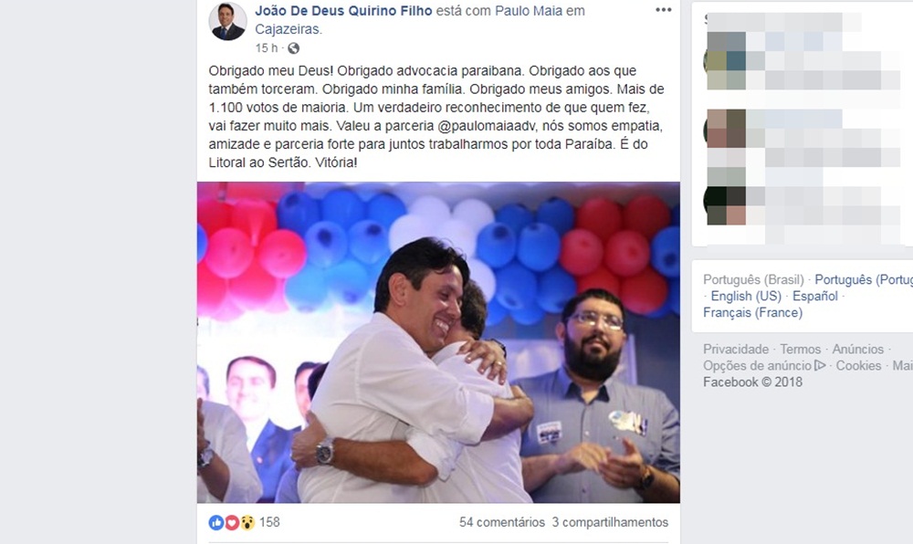 “Obrigado meu Deus! Obrigado advocacia paraibana. Obrigado aos que também torceram. Obrigado minha família. Obrigado meus amigos". Postou ele.