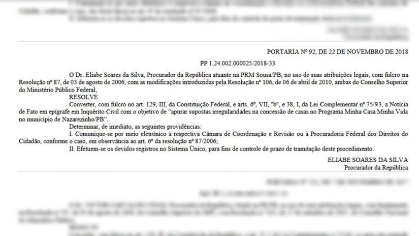 Foi aberto pelo Ministério Público Federal, um inquérito civil para apurar e investigar supostas irregularidades na concessão de casas pelo programa Minha Casa Minha Vida na cidade de Nazarezinho, região de Sousa, no Sertão do estado.