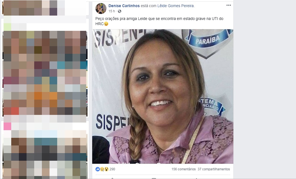 A ex-prefeita Denise Albuquerque (PSB) usou sua conta pessoal do Facebook para pedir oração para a professora. “Peço orações pra amiga Leide que se encontra em estado grave na UTI do HRC”. Postou a socialista.