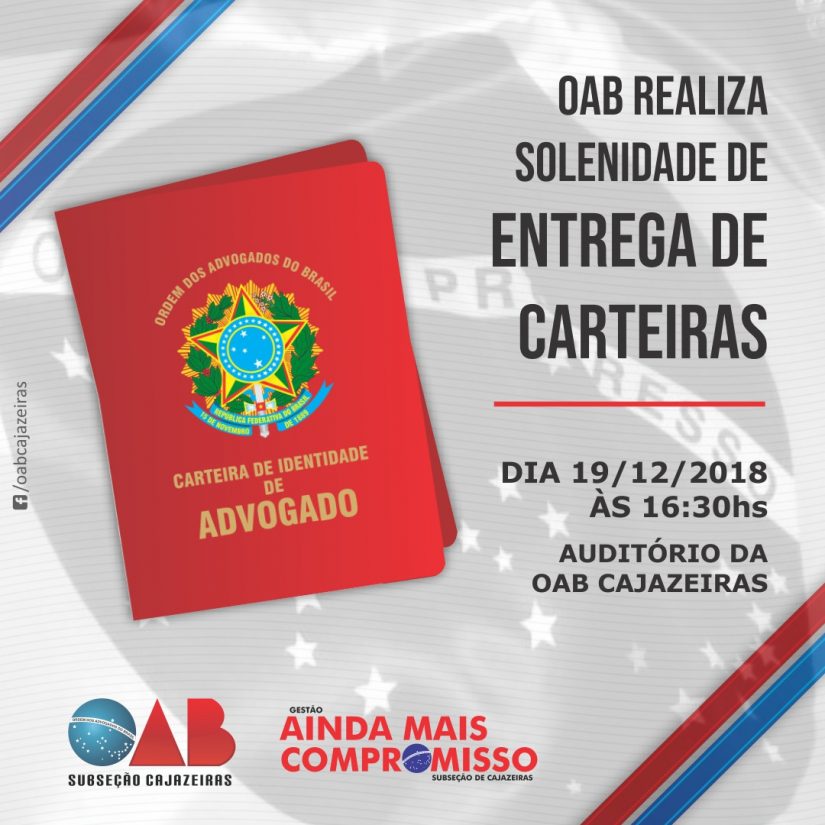 Finalizando os atos de entrega de carteiras em 2018, nesta quarta-feira (19/12), a OAB, Subseção de Cajazeiras, realiza solenidade para tomada de juramento e entrega de carteiras a novos advogados e um estagiário, em evento que ocorrerá às 16h:30m no auditório da sede local.
