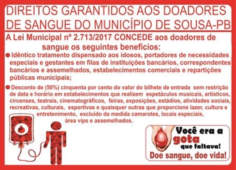 A lei municipal de nº 2.713/2017 de autoria do vereador José Rudolph Diniz (PSDC), traz alguns benefícios aos doadores de sangue, na cidade de Sousa, Sertão da Paraíba.