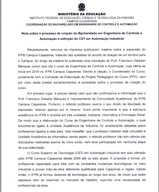 Um grupo de professores do Instituto Federal da Paraíba, Campus de Cajazeira divulgou Nota de Esclarecimento nesta sexta-feira (21), sobre reportagem divulgada neste veículo de comunicação, que trata sobre a doação de terreno feita por empresários da cidade ao instituto.